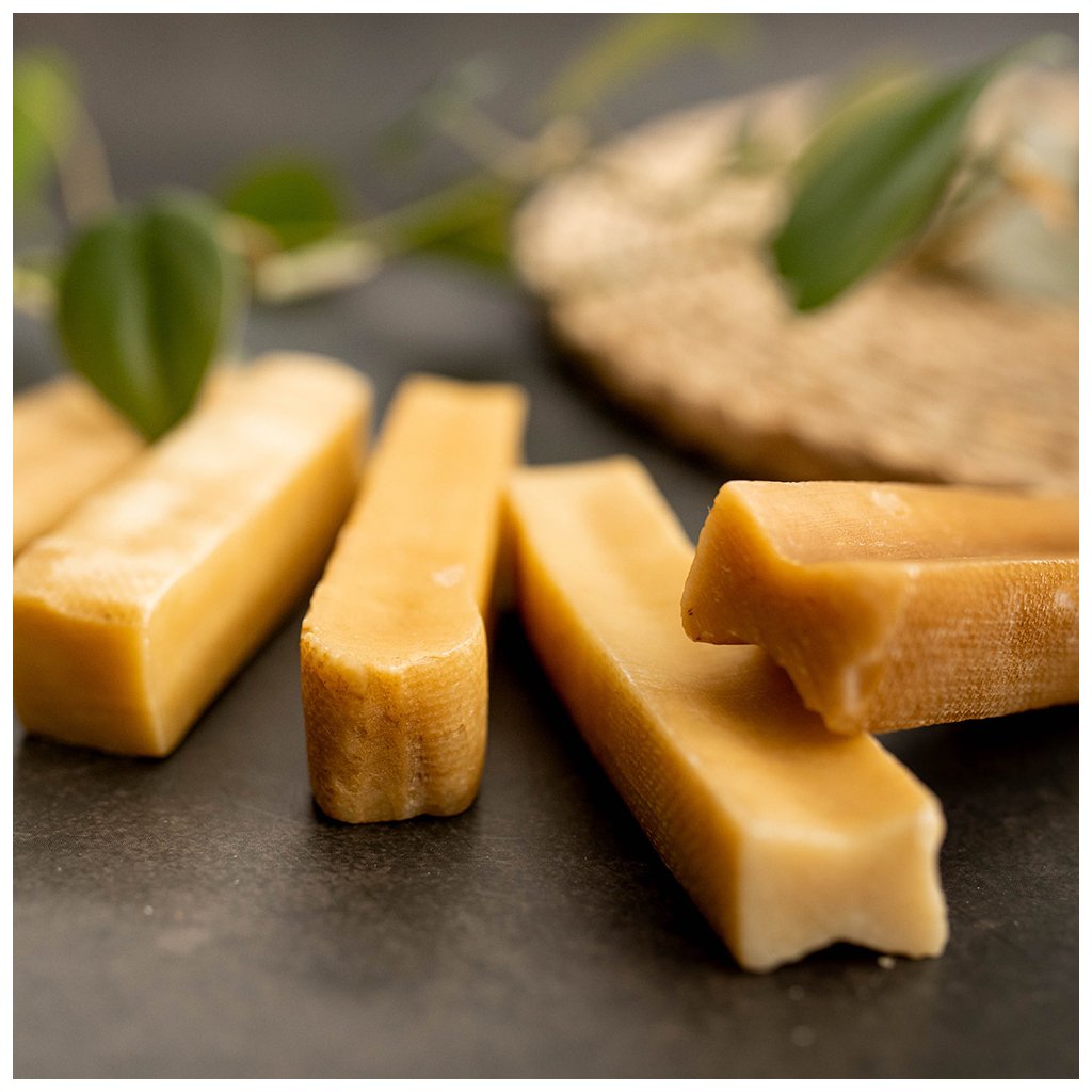 Himálajské sýry, ze kterých jsou tyto pamlsky vyrobeny, pocházejí z mléka volně chovaných himálajských krav. Proces výroby začíná hodinovým vařením mléka, aby se odstranil veškerý tuk a zajistila se pasterizace. Potom se přidává trocha soli a limetkové šťávy (celkem jen 0,01 %) ke srážení. Následuje lisování sýra po dobu 2-3 dnů, aby se odstranila vlhkost. Bloky sýra jsou pak nakrájeny na přiměřeně velké kusy a sušeny v udírně po dobu 20-30 dnů, což jim dodává tvrdost a jemnou, kouřovou chuť.