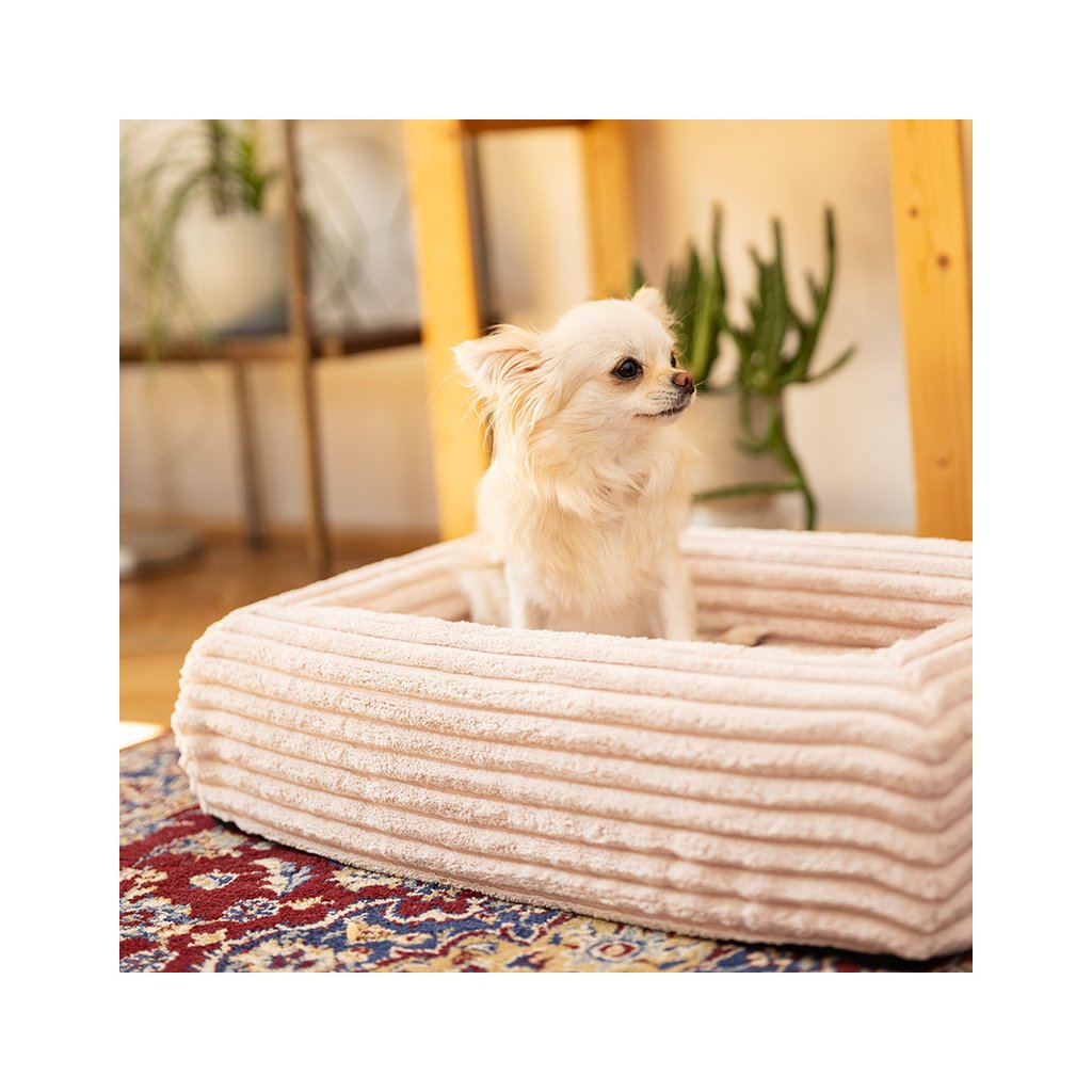 - Pocit jistoty: zvýšené bočnice vytvářejí chráněný prostor, kam se pes rád schoulí a odpočine si. Zároveň si na ně může položit hlavu.